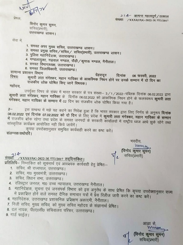 उत्तराखंड सरकार ने स्वर कोकिला लता मंगेशकर के निधन पर दो दिन का राजकीय शोक घोषित किया।