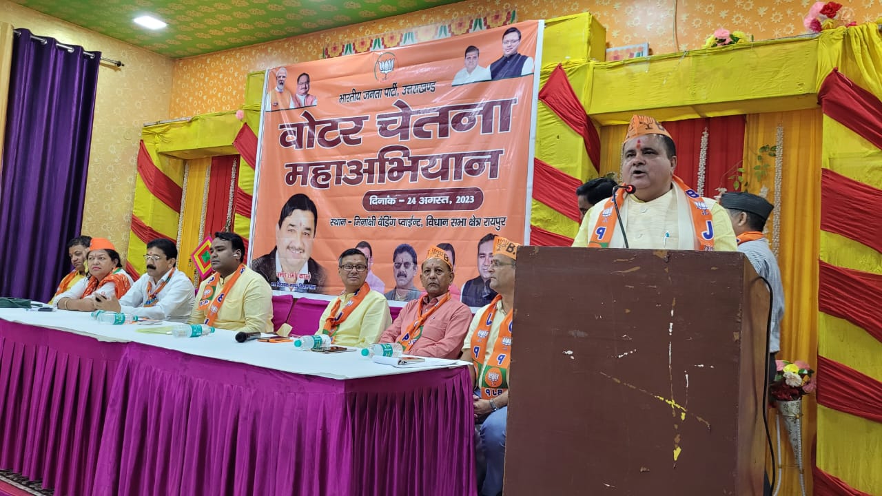 भारतीय जनता पार्टी के प्रदेश अध्यक्ष आदरणीय महेंद्र भट्ट जी ने रायपुर विधानसभा के सभी कार्यकर्ताओं को संबोधित करते हुए कहा कि भारतीय जनता पार्टी का वोटर चेतना अभियान राष्ट्रव्यापी अभियान है हमें इस अभियान के तहत अपनी विधानसभा में 18 वर्ष पूर्ण करने वाले सभी युवाओं को उत्तर सूची में लाने के लिए जागरूक करना है भारतीय लोकतंत्र को मजबूत करने में मतदाताओं का बहुत अहम योगदान रहता है साथ ही मतदाताओं को भारतीय जनता पार्टी एवं उसके कार्यों का जानकारी देना अभियान की टोली की महत्वपूर्ण भूमिका रहेगी। इस अवसर पर प्रदेश अध्यक्ष महेंद्र भट्ट ने सभी पदाधिकारी को आवाहन करते हुए कहा कि वाटर चेतना अभियान की समिति घर-घर जाकर मतदाताओं का चयन करेगी।